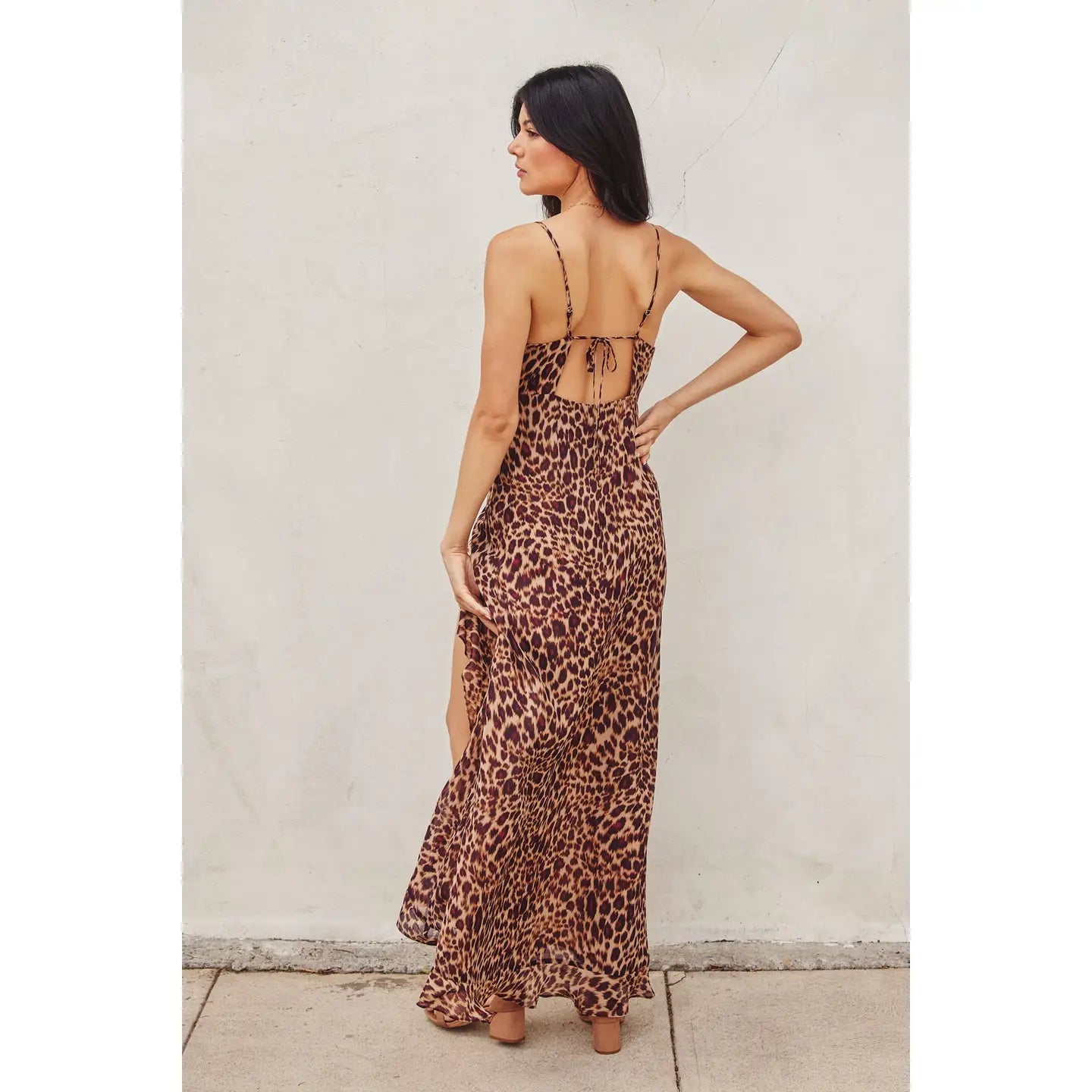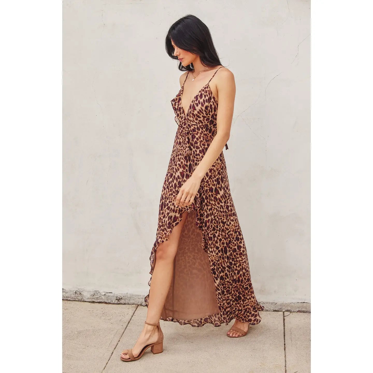 Animal print maxi dress featuring asymmetrical ruffle details. Model is 5'8" and wearing size Small. - Plunging V-neckline with a hook and eye closure - Asymmetrical ruffle details - Ruffled high-low hem - Hidden side zipper closure - Adjustable shoulder straps - String tie closure on the back -