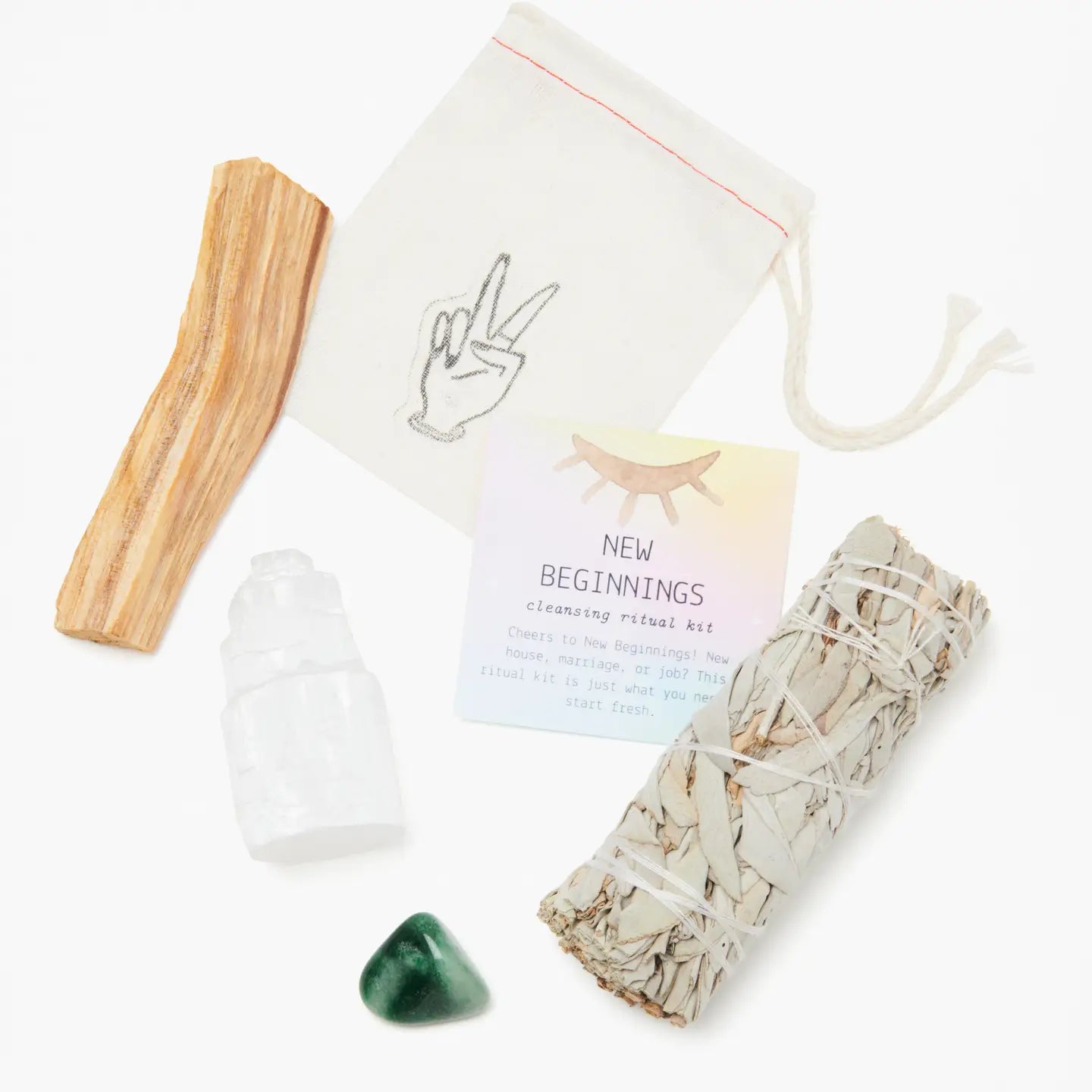 1 sage stick: purify, release, cleanse 1 selenite tower: energize, charge, unblock 1 palo santo stick: uplift, enhance, soothe 1 tumbled green aventurine May come packaged in a box w/ clear lid, or clear bottle.